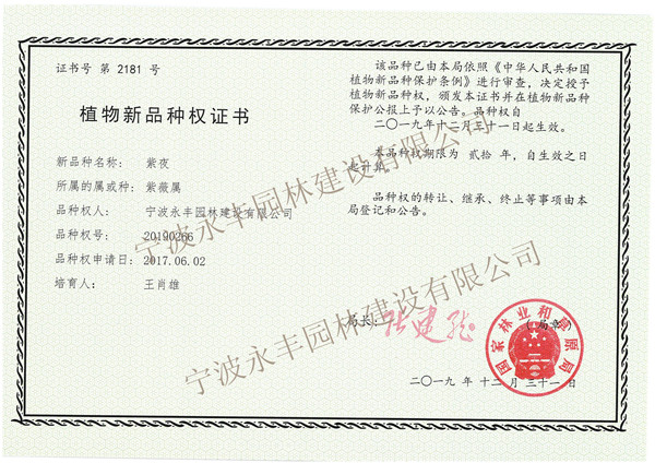 紫夜 植物新品種權(quán)證書